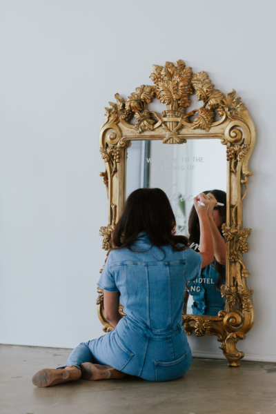 Stefanie was the girl in school everyone nominated for “prettiest handwriting”. Flash forward about 5 years and she decided to turn her “pretty handwriting” into a side hustle. Essentially if something can be written on, engraved, burned or etched, she can personalize it for you! (Just take a peek at her Instagram feed to see what all she can do! Seriously – everything from mirrors to cookies!) While she still takes on custom project requests for Bible verses, graduation certificates, or wedding vow prints, these days, she primarily focuses on three specific areas of her business: 1) on-site lettering events for brands, 2) teaching others the art of modern calligraphy, and 3) providing envelope addressing, place card and rental signage services for weddings throughout North and South Carolina. (Y’all – these mirrors are unmatched! Kinda makes these two old married ladies want to grab our hubbies and renew our vows, just so we can have some of these mirrors created!)